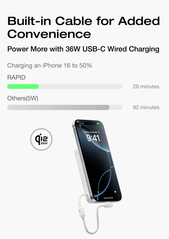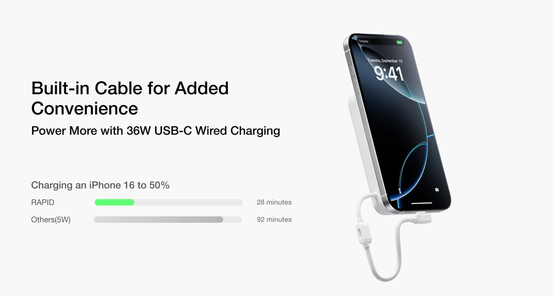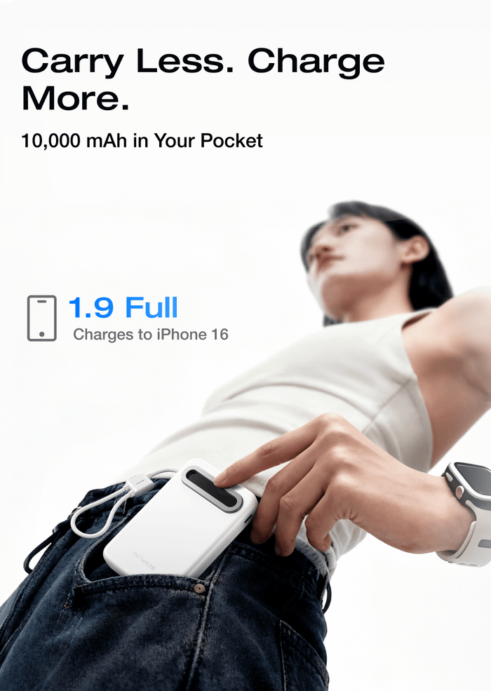 10,000mAh in Your Pocket: Slim enough to slip into your pocket, yet powerful enough to charge your iPhone 16 up to 1.9 times. RAPID's 10,000mAh battery gives you all-day power without the bulk.