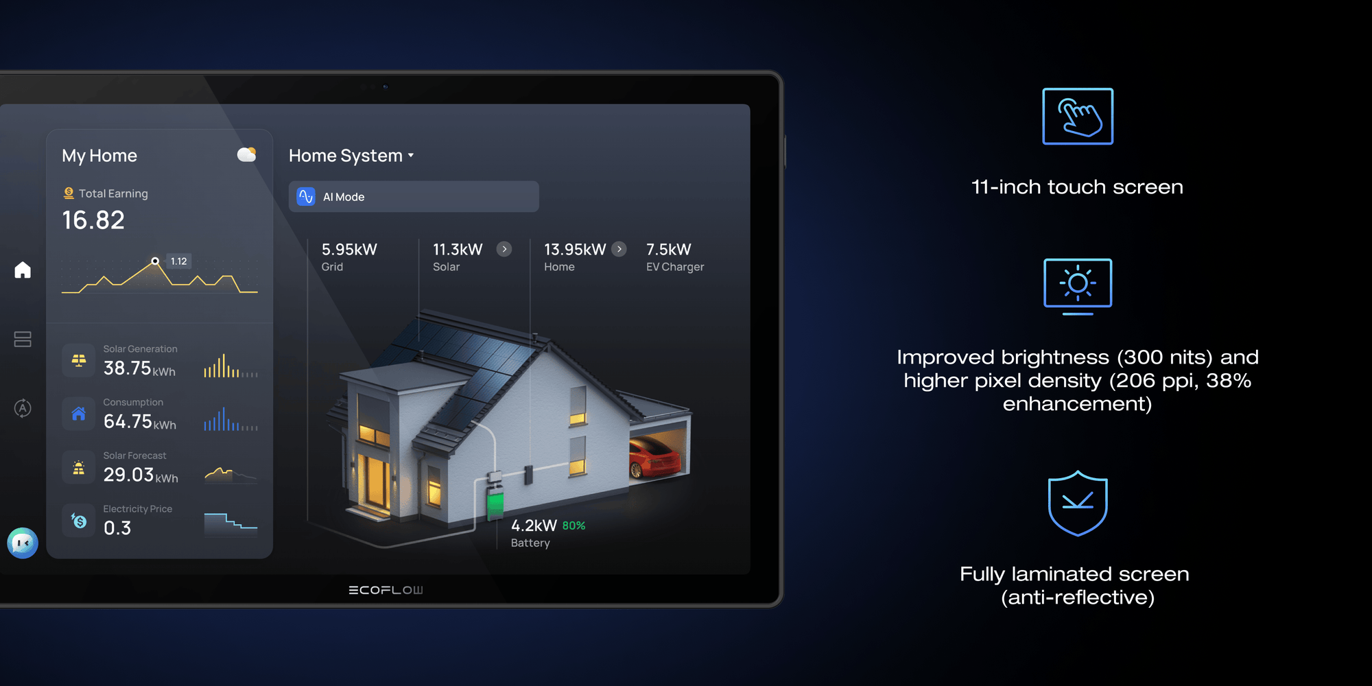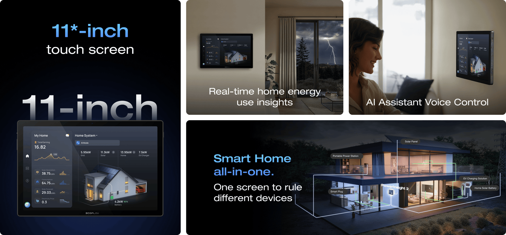 The PowerInsight 2 display connects to the EcoFlow IoT cloud via Wi-Fi to access system data and manage the power system's lifecycle from generation to storage and consumption. It can also integrate other brands' devices via the Matter protocol, such as thermostats, smart plugs, and smart light bulbs.