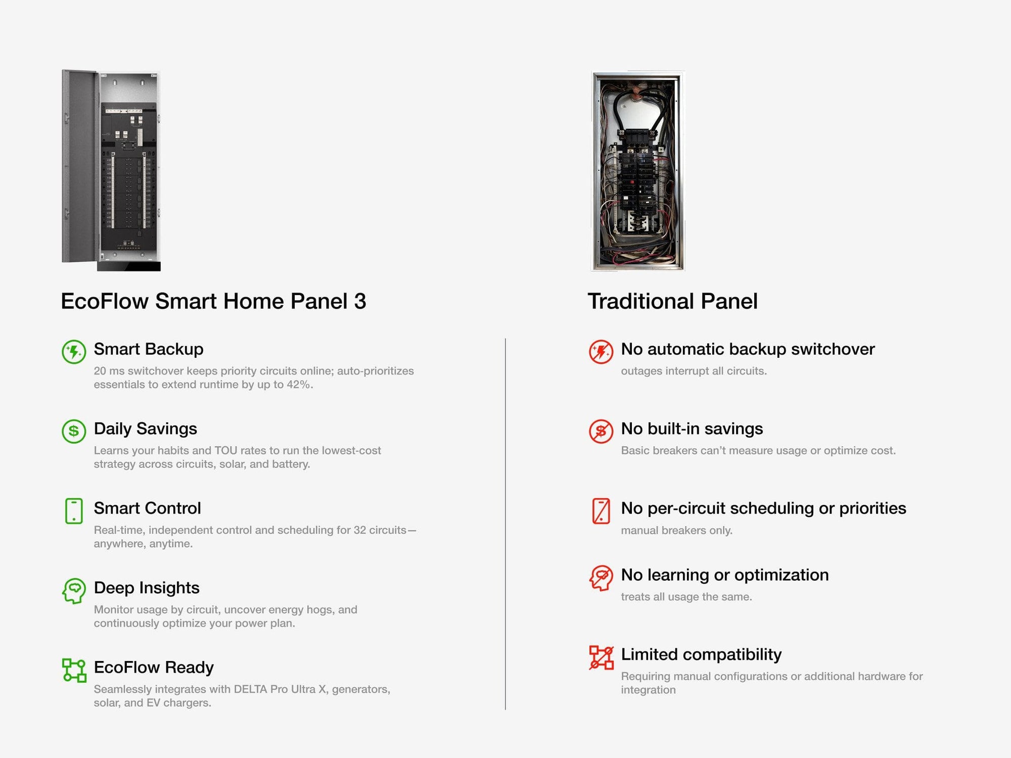 EcoFlow Smart Home Panel 3 is a smart electric panel with 32 independently controlled circuits. Fully compatible² with DELTA Pro Ultra X, generators, solar panels, and EV chargers, it delivers a seamless whole-home³ energy experience—with instant, automatic backup during outages.