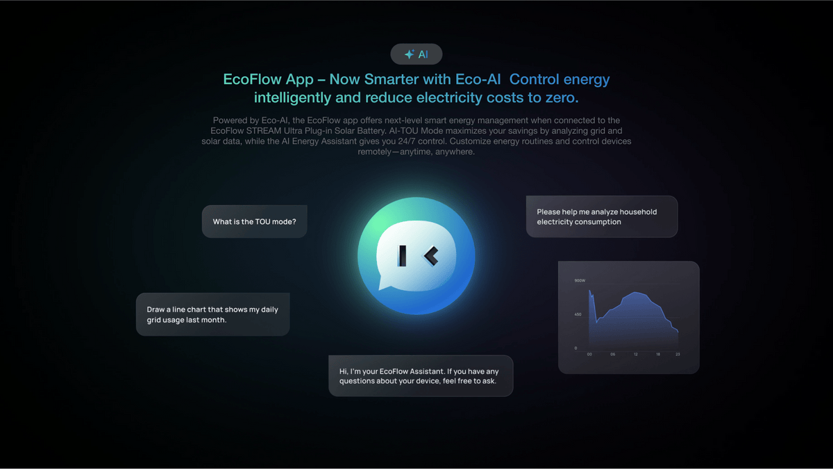 Powered by Eco-AI, the EcoFlow app offers next-level smart energy management when connected to the EcoFlow STREAM Ultra Plug-in Solar Battery. AI-TOU Mode maximizes your savings by analyzing grid and solar data, while the AI Energy Assistant gives you 24/7 control. Customize energy routines and control devices remotely—anytime, anywhere.