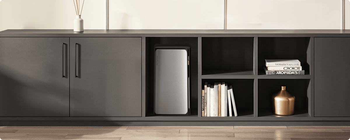 Engineered with a 50% smaller footprint than conventional systems, our ultra-sleek unit blends seamlessly into your living space with concealed cable routing and flush-mount architecture. Tuck it behind curtains, nestle it beside planters, or wall-mount it as functional art—the anodized aluminium finish complements any décor.