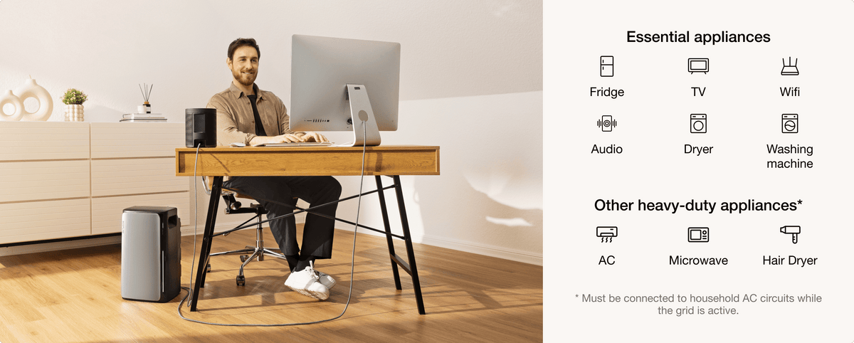 EcoFlow STREAM Ultra uses AC coupling technology, allowing flexible indoor placement. Simply plug in to store solar energy in any room—directly powering appliances like fridges, washing machines, or coffee makers without the mess of extension cables.