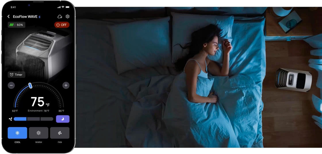 With EcoFlow's advanced software algorithm, the WAVE 2 offers multiple modes and app control. It runs quietly (44 dB) in Sleep Mode and up to 8 hours in Eco Mode. Experience longer-lasting comfort in your tent, RV, or home with its powerful and portable design.
